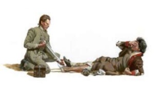 An image of early medical care, a physician bandaging a soldier’s foot. Illustration by Don Troiani, courtesy National Park Service.